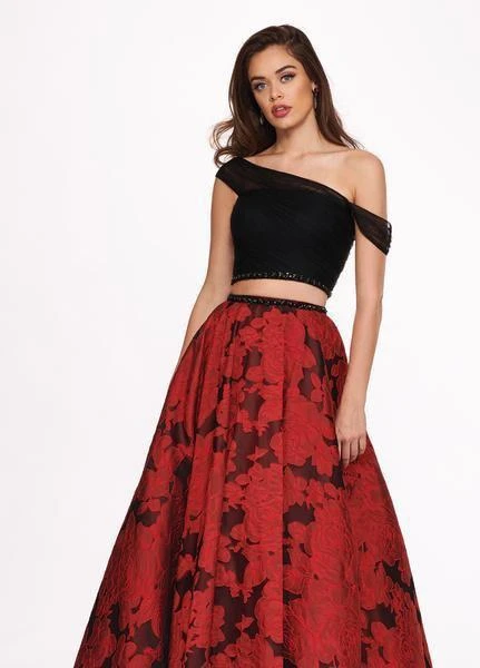 Feel like a dainty belle as you impress the crowd with this beautifully tailored Rachel Allan 6473 long evening gown. This stunning 2-piece gown charms with one-shoulder asymmetrical strap, and a draped sleeves on the other. The bandeau style tulle bodice is ruched and fitted, with tonal beaded edges leading to the bare midriff. The floral jacquard skirt complements to the beautiful full-length A-line finish of the dress. Be effortlessly breathtaking with this Rachel Allan evening gown.