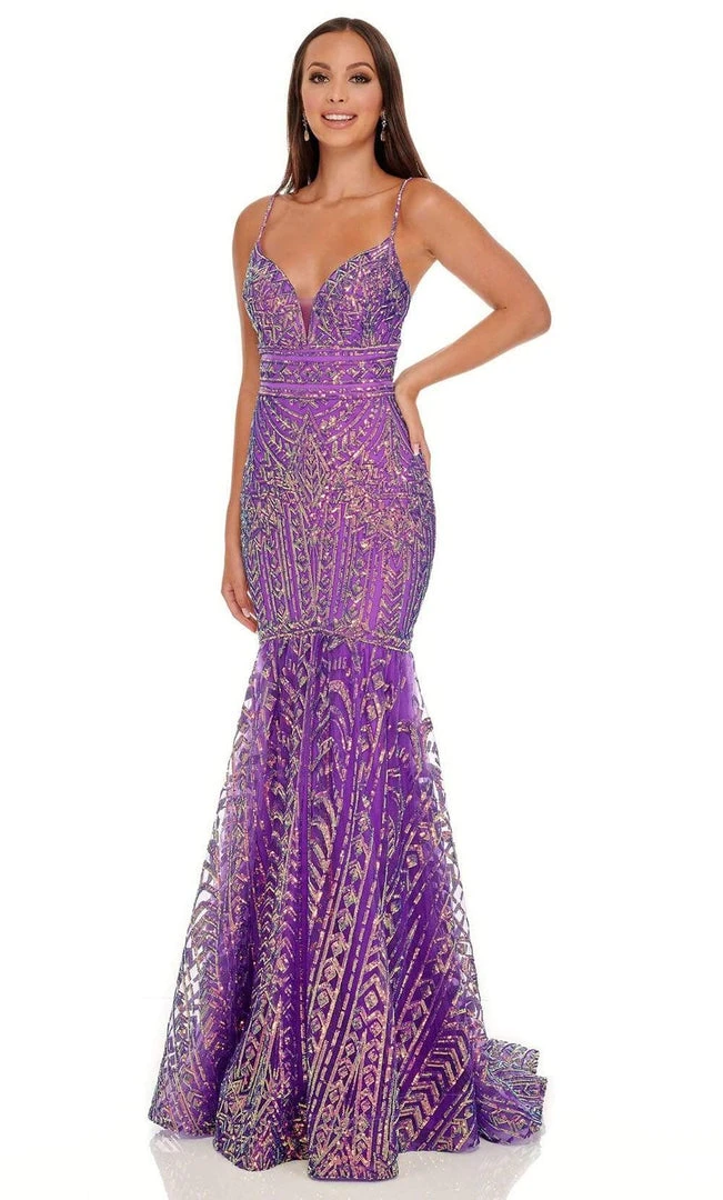 Get ready to show off your glamorous side in this Rachel Allan 70071 evening dress. This stunner showcases a flattering plunging sweetheart v neckline with thin straps that wrap over the shoulders into a cage style back. The trumpet skirt flares out right above the knees providing you the fit and flare style. The whole dress is designed with iridescent hand sewn bead works for a shimmering effect. Standout among the fabulous crowd as all eyes focus on you in this lovely Rachel Allan creation.