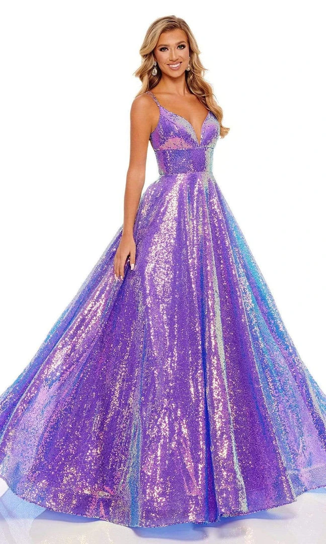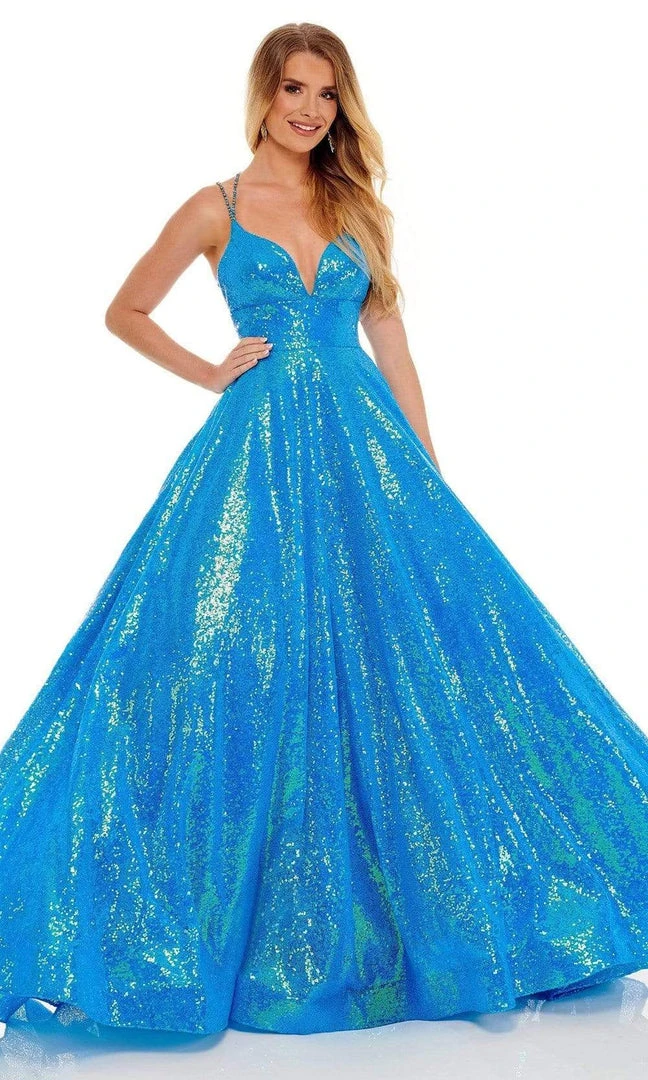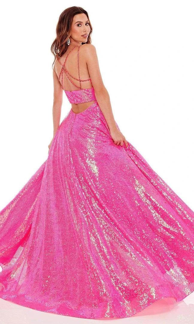Mesmerize all night long in this figure defining Rachel Allan 70130 creation. Glimmering with iridescent sequins ornamenting its glamorous length, this exquisite gown flaunts a deep v-neckline with spaghetti straps. The open back is accented with multiple strapped pattern. Adorned with a stunning low cutout at the back, the skirt reveals an A-line silhouette as it streams into a sweeping train. Wrap yourself in the iridescence and pure elegance of this stylish Rachel Allan masterpiece.