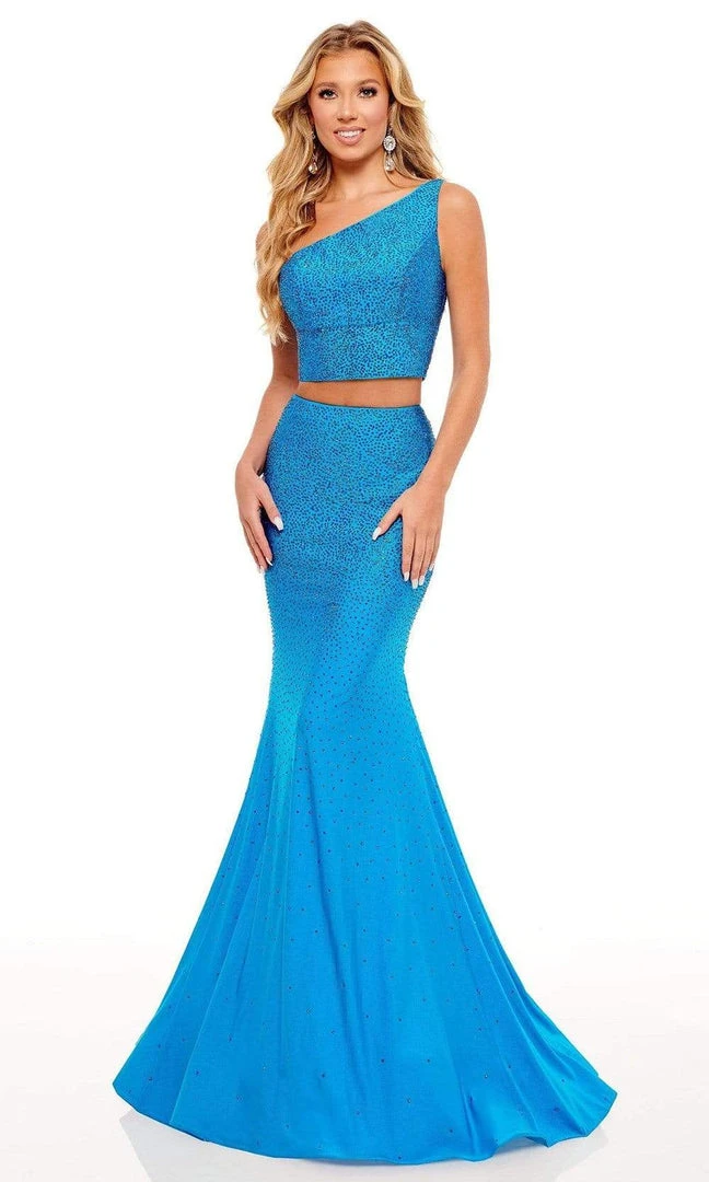 Emanate radiance and sophistication on your upcoming event in this stylish Rachel Allan 70255 creation. Crusted with rhinestone on a sleek lycra jersey silhouette, this two-piece gown parades a one shoulder neckline with a wide band wrapping the midriff. Styled with a fitted cropped top with shimmering stones and a partial open back, the skirt creates a mermaid silhouette with an ornate train. Radiate a sultry yet classy flair on this inspired Rachel Allan masterpiece.
