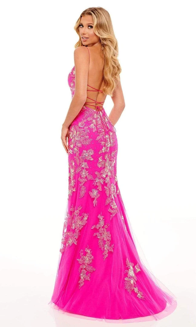 Aspire to claim everyone’s hearts on your upcoming event in this exceptional Rachel Allan 70270 creation. Adorned with floral sequined accent, beadwork and embroidered details, this spaghetti strap gown crafts a scoop neckline on a fitted bodice. The back is ornamented with a lace up tie design. Rendered with a sexy high slit for leg exposure, the adorned mermaid skirt traverse to the floor with a beautiful train. Radiate a sultry yet classy flair on that special night in this Rachel Allan masterpiece.