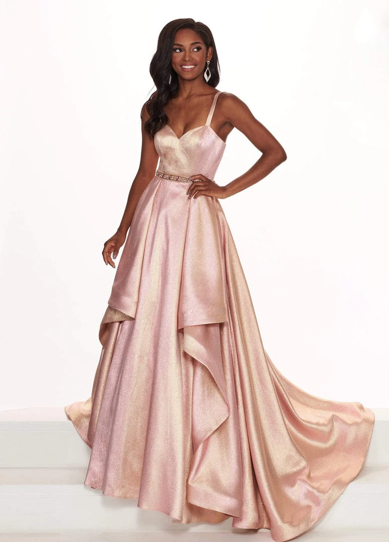 You are sure to be the life of the party when you are wearing this dazzling look by Rachel Allan 5061. This metallic woven dress captivates in a sleeveless, sweetheart neckline with bodice supported with thin straps. The waist is wrapped in a thin embellished band and flourishes a full length A-line skirt with sweep train finish for added drama. This enchanting Rachel Allan style is sure to make you the center of everyones attention.