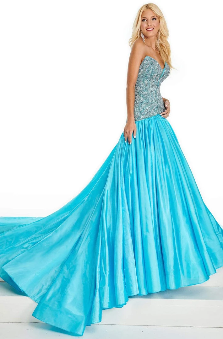 Show off your classy style when you wear this Rachel Allan 5116. This bejeweled beauty is tailored with a deep sweetheart neckline with mesh, stone accents all over, dropped waist, open back, and a zipper closure. The ball gown skirt features pleats and a cathedral train. This Rachel Allan definitely parades the elegant and classy style. Model is wearing blue.