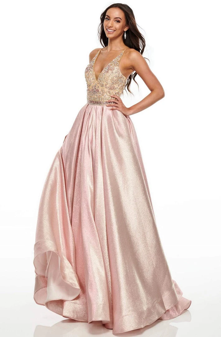 Outshine everyone with the pure romance of this Rachel Allan Prom 7002 creation. Intricately embellished with rhinestones over a nude lining, this piece shows a plunging v-neckline with an illusion inset. A bandeau strap with strappy details graces the back. A bead-embellished band hugs the waist. The metallic sheened A-line skirt cascades into lush waves and ends with a train. Look and feel like a stellar vision in this Rachel Allan masterpiece.