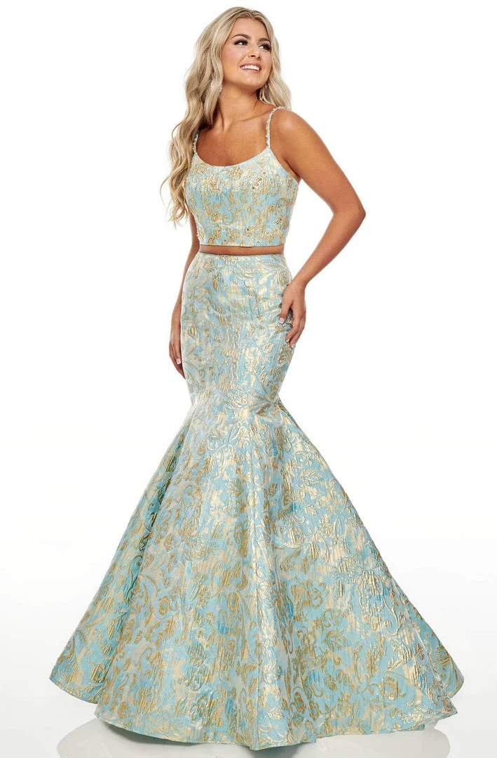 Orchestrate a spectacular evening of dazzling sophistication in this luxurious dress by Rachel Allan Prom 7050. This two piece metallic brocade dress enchants in a sleeveless, scoop neckline with beaded straps. The back has a zipper closure while the dramatic mermaid skirt finishes in a sweep train. Exhibit exceptional style in this superb evening gown by Rachel Allan Prom.