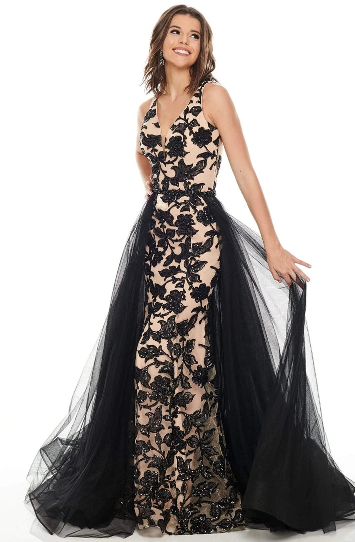 Look jaw dropping in this dramatic in this Rachel Allan 7130. Tailored with a plunging V-neckline, this tulle stunner is adorned with sequin detailing, embellished waistband, and a sheer back. Tom complete the look is an A-line silhouette skirt, featuring horsehair hem detail, and a sweep train. This Rachel Allan creation is ideal for red-carpet occasions.