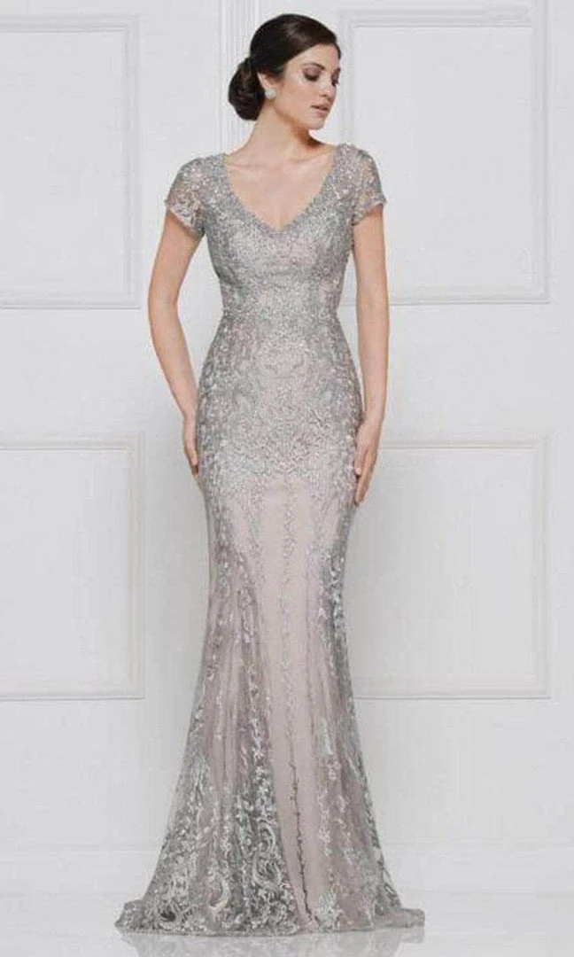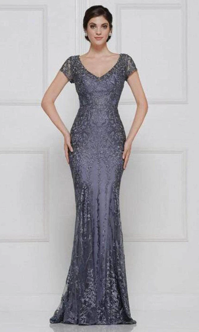 This lace gown charms with a plunging V-neckline and short sleeves. The fitted bodice highlights your curves and from the waist begins a full length trumpet skirt with a sweep train finish. Model is wearing the Slate Blue color.