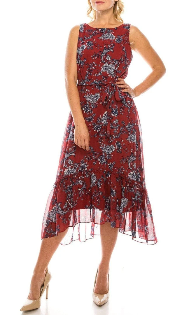 | Details: | Sleeveless, Floral Print, Self-Tie Sash, Full Back, Side Zipper Closure, Lettuce-Trimmed Tier, High Low Hem |
