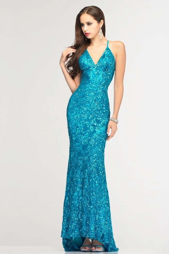 The plunging v-neckline, thin cross back straps, fun motif daring open back gives this classy dress an edgy and daring feel. ?í Thin, cross back straps ?í Plunging neckline ?í Sequins and beading with motif ?í 100% Silk ?í Polyester Lining