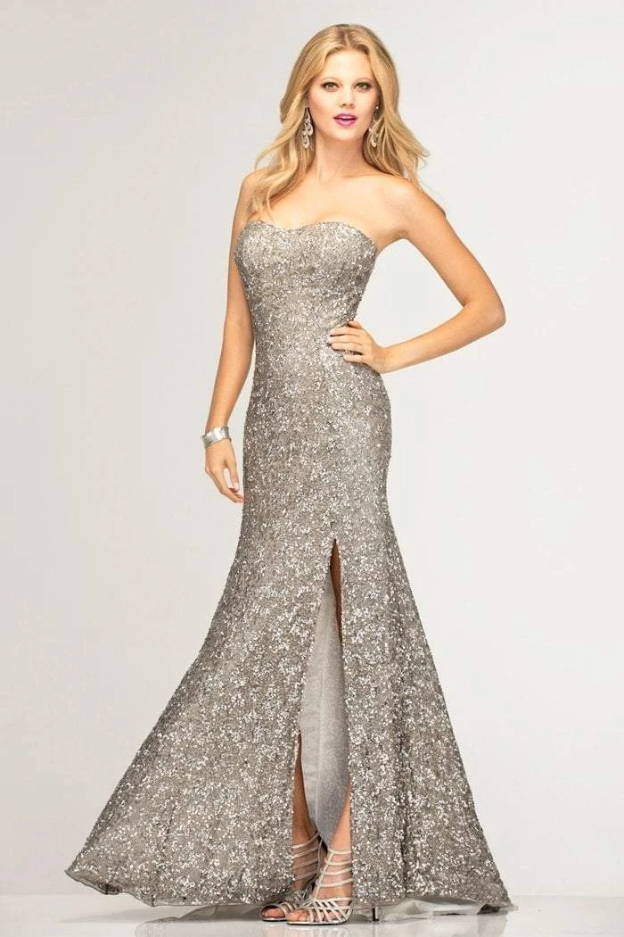 Full length, fully sequined dress has a slight sweetheart neckline and an eye catching motif created by the sequins. ?í Slight sweetheart neckline ?í Strapless ?í Sequins with motif ?í 100% Silk ?í Polyester Lining