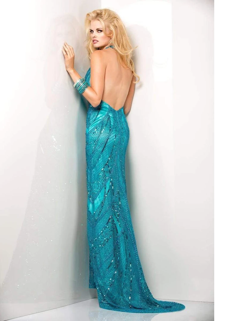 Show off your sexy back in a dramatic open back halter gown by Scala 48397.