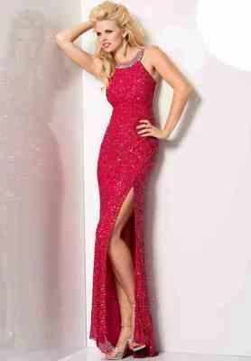 Another stunning design by Scala. With a beaded high neckline, fitted silhouette, and open back this Scala prom dress 48406 is absolutely gorgeous. You will look and feel like a beauty queen when you enter any room. Show off your fabulous heels through a side front slit. Ideal for prom or winter formal. Compliment this elegant dress with chandelier earrings, rhinestone bracelets, and small clutch to keep your cell phone and lip gloss