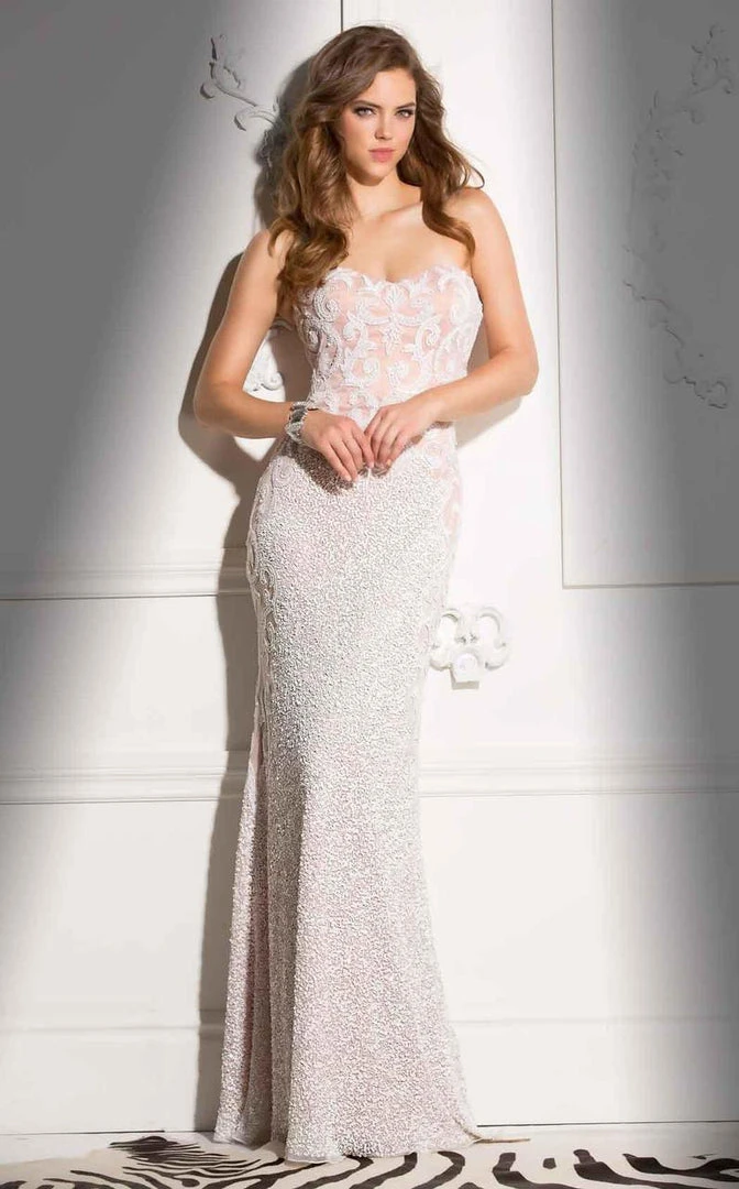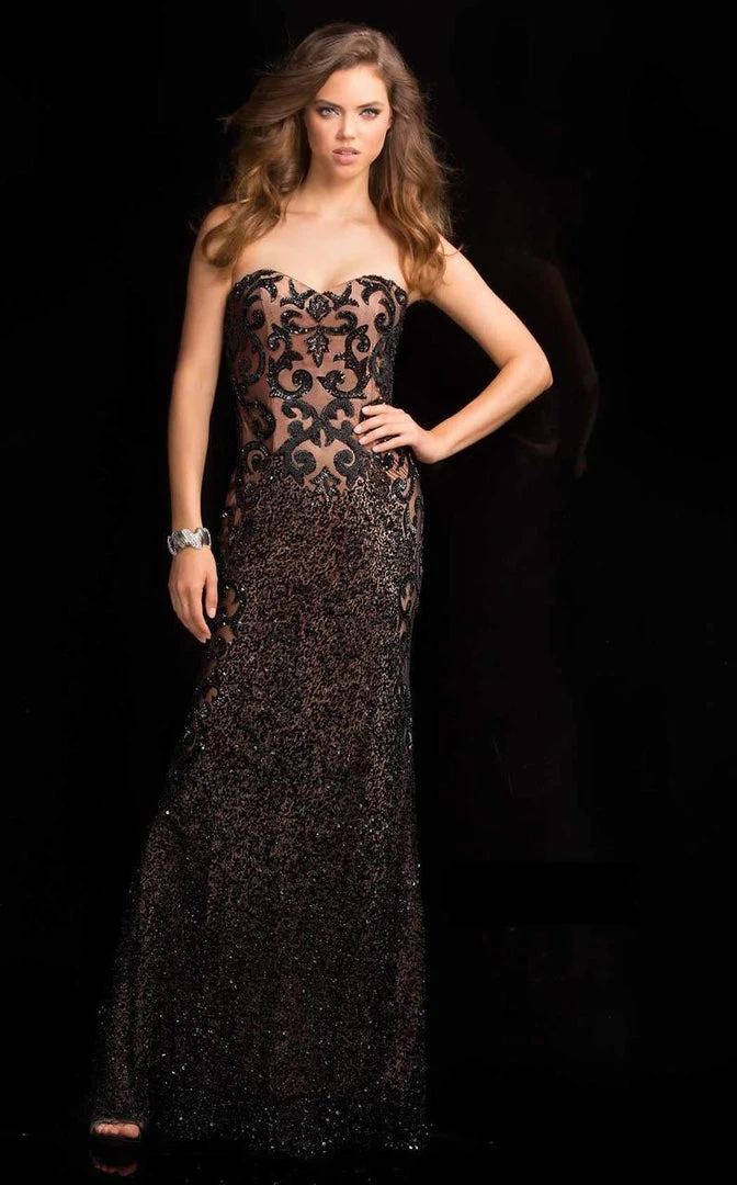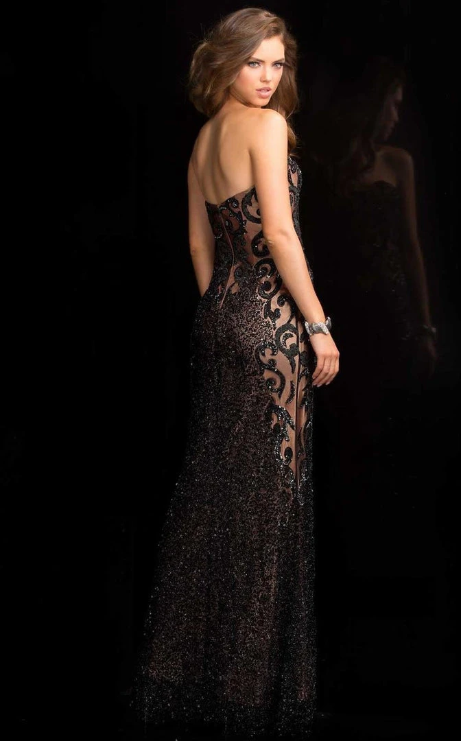 Make a statement at prom in this extravagant fitted Scala dress 48680. Intricate bead work is layered on top of a nude lining along the bodice which is finished off with a classic sweetheart neckline. The fitted skirt is drenched with shimmering sequins and crystals that are sure to catch the light. You will wow the crowd in this evening dress by Scala!?á