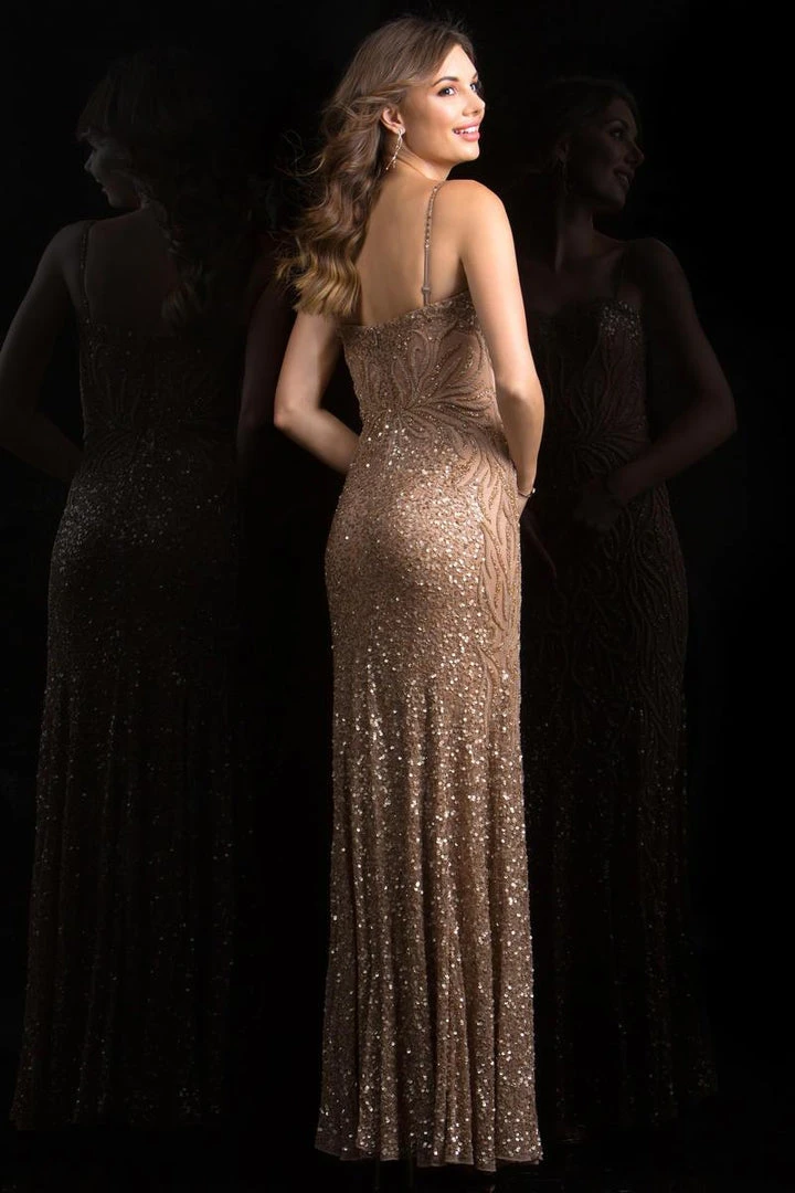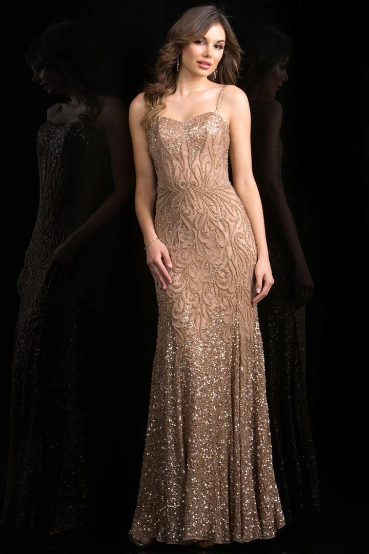 | Details: | Removable Spaghetti Straps, Sequins, Scroll Motif, Mid-Open Back, Back Zipper Closure, Full Length Hem |
