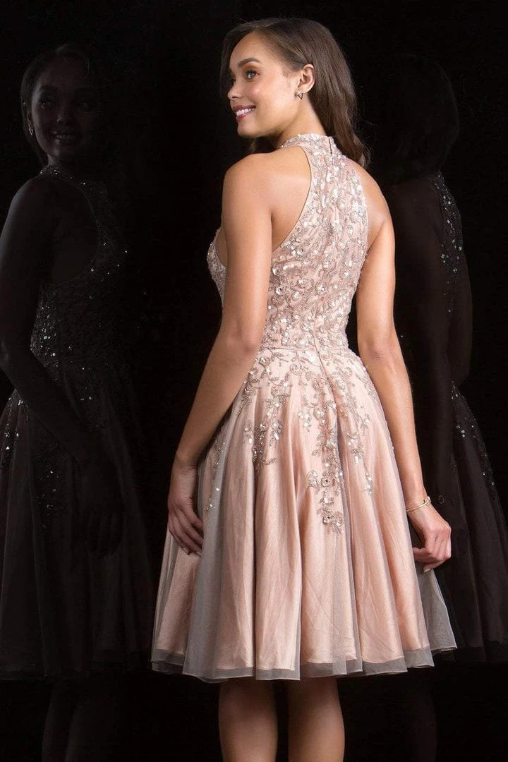 Show of your bubbly and pleasant personality with this dazzling cocktail dress by Scala 48822. The sleeveless bodice is fitted and boasts a high halter neckline and a closed back. Elusive complimentary beading winds gently in floral patterns from the neckline, to the waist, where it dribbles onto the skirt in sparse vertical lines. This dress has a nipped waist with an A-line skirt and tulle overlay ending in a knee-length hemline. This Scala ensemble will surely let you dance all night long.