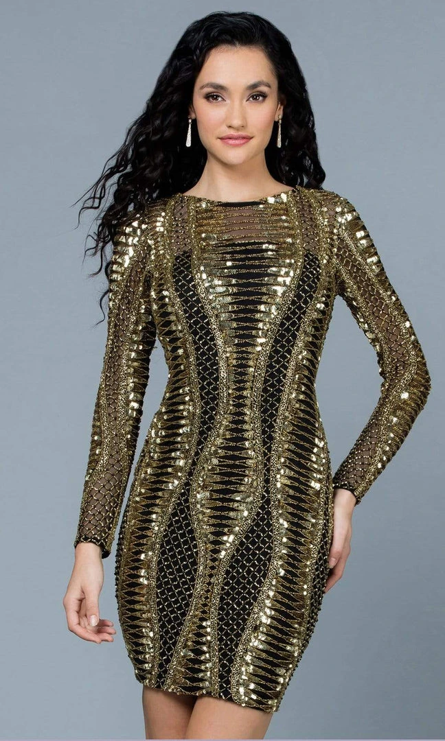 | Details: | Sequin Embellished, Lattice beadings, Sheer Long sleeve, Lined, Enclosed back, Invisible back zipper closure, Fitted Bodice, Mini length |