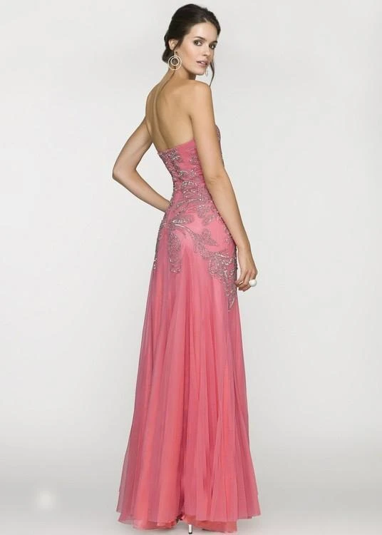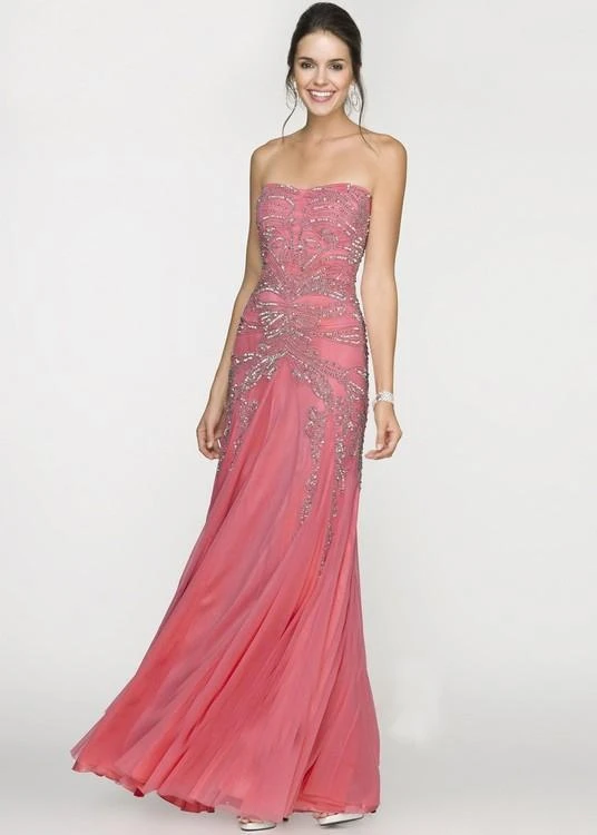 Regal and ravishing, this glamorous evening dress will make you feel like a princess. The strapless bodice has a slight sweetheart neckline and twinkles with a terrific array of sparkling crystal adornments to enhance your shape. This full-length gown flows to the floor in waves of ethereal fabric in this lavish red carpet look