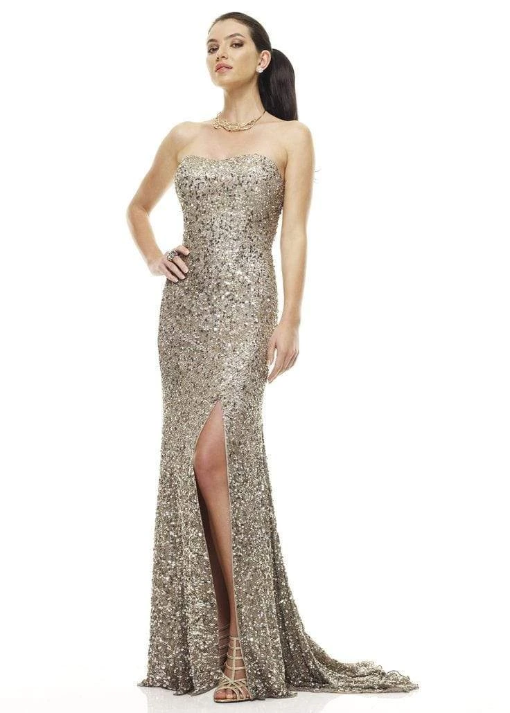 | Details: | Sequined, Sweetheart neckline, Sheath skirt, Strapless, Side slit skirt, Back zipper closure |