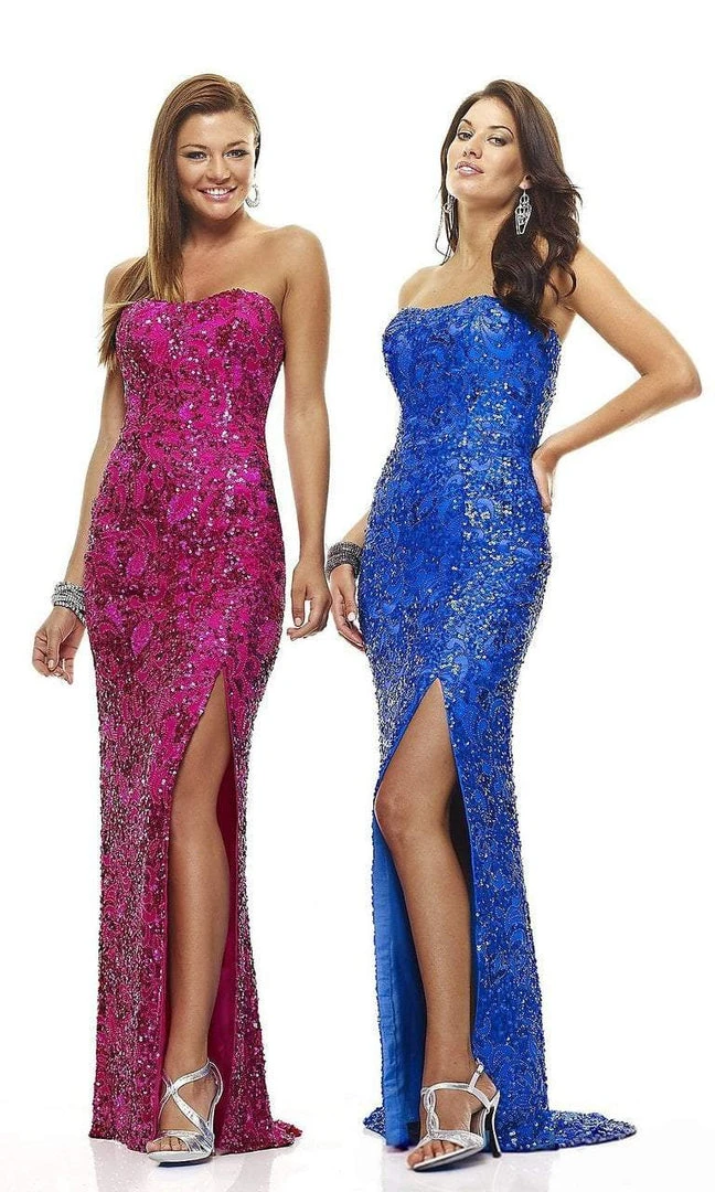 Full length gown with a slight sweetheart neckline and thigh-high slit. The pattern of the sequins creates a beautiful floral motif. ?í Strapless, slight sweetheart neckline ?í Floral motif ?í Sequins and beading ?í 100% Silk ?í Polyester Lining