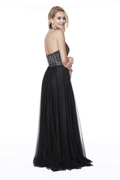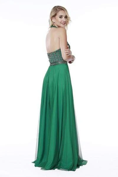 This stunning dress showcases an embellished halter v-neck bodice and an open back. It also features a matching embellished waistband detail that enhances your waistline while sheer layers flare out from the waist down to form a full gathered skirt that reaches the floor.