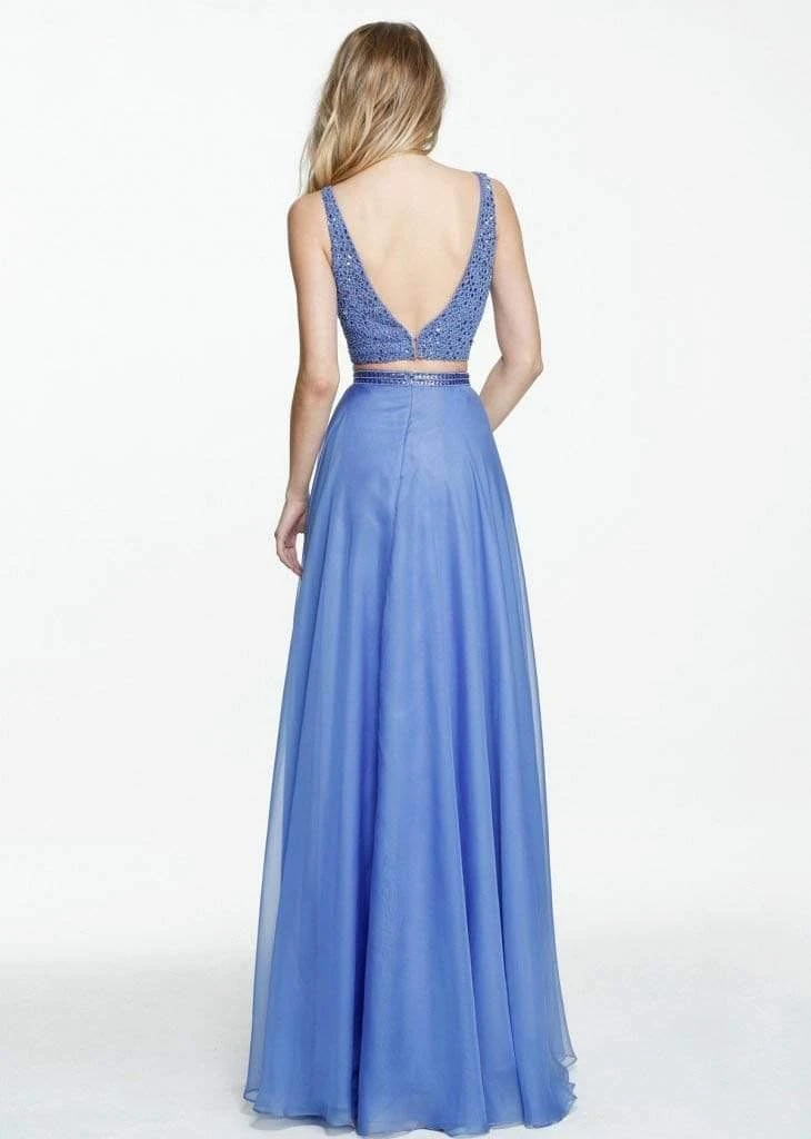 | Details: | Two-Piece, Beaded, Tonal Illusion Inset, V-Open Back, Back Zipper Closure, Embellished Waistband, Full Length Hem |