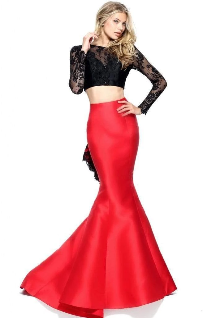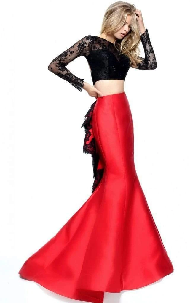 Reveal hidden charms in this lovely evening gown by Sherri Hill 51169. This two piece dress glams in a bateau neckline with lace crop top styled with long sleeves, a charming sweetheart lining, and shows off an open back. The skirt forms a full length mermaid silhouette with a back zipper closure, ruffle detail at the back, and finishes in a sweep train. Exude a charm that is meant to mesmerize the elite crowd in this gorgeously decadent Sherri Hill dress.