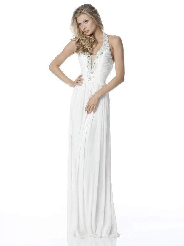 Enhance your visual appeal in this luxurious dress by Sherri Hill 51552. This long dress features a sleeveless, deep halter V-neckline with sheer inset at mid-bust. The ruched bodice flaunts an open back and from the waist begins a full length sheath skirt. You’ll look fantastic in photos with a beautiful gown from Sherri Hill. Model is wearing Ivory color.