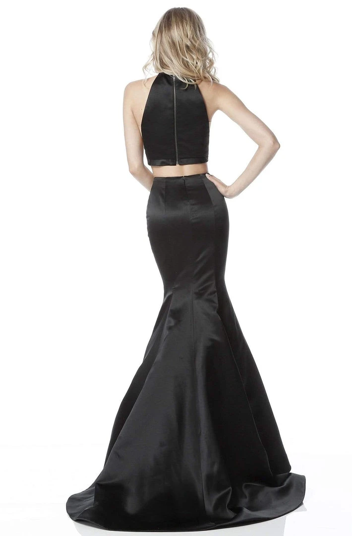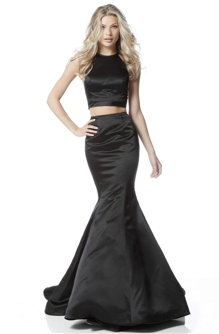 Crop tops have been all over the red carpet this season! Rock the latest trend wearing this chic two-piece gown by Sherri Hill 51585. Features a halter style cropped top with side cut-outs on the bodice with nude mesh inset. This satin gown features a full-length figure flattering mermaid skirt that finishes with a dramatic sweep train. Be in this gorgeous Prom Dress / Evening gown collection by Sherri Hill and leave a lasting impression!