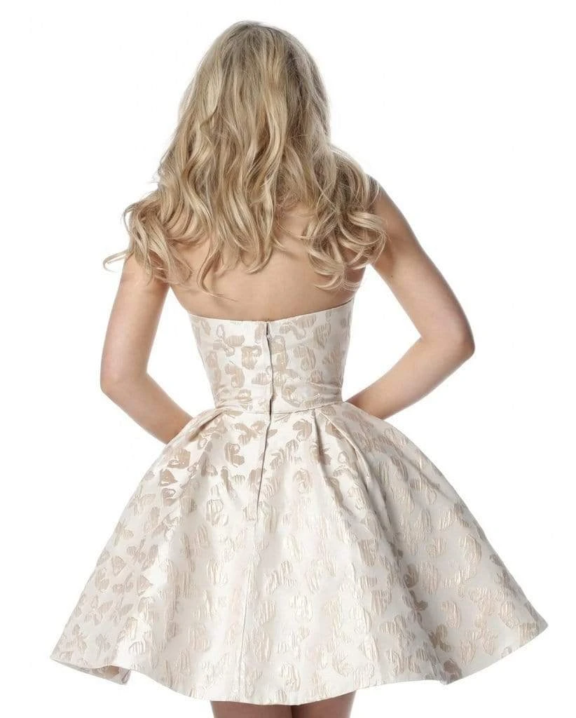 Be a vamp in an alluring dress from Sherri Hill 51598. Made of gold metallic print taffeta, this cocktail dress features a strapless, straight across neckline with a fitted bodice. From the waist begins a mid-thigh A-line skirt with pockets. Embrace a style that is immaculately sultry as you glam up for your event in this Sherri Hill creation.