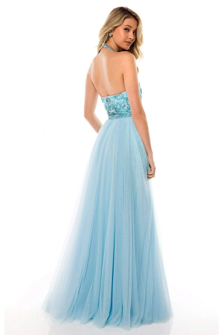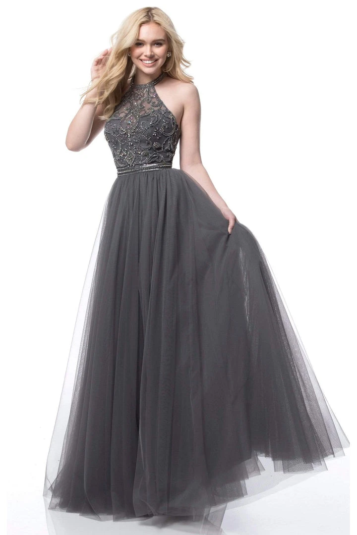Be the embodiment of feminine beauty in this Sherri Hill 51604 creation. Embellished with faceted crystals on a cut-in bodice, this stunner shows an illusion halter neckline over a sweetheart lining and a mid-open back. Crowned with an embellished waist, the tulle skirt cascades glamorously into a full-length hemline. Glamour up for that idyllic event in this Sherri Hill masterpiece. Models are wearing the Blush, Gunmetal and Light Blue colors.