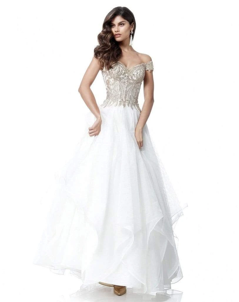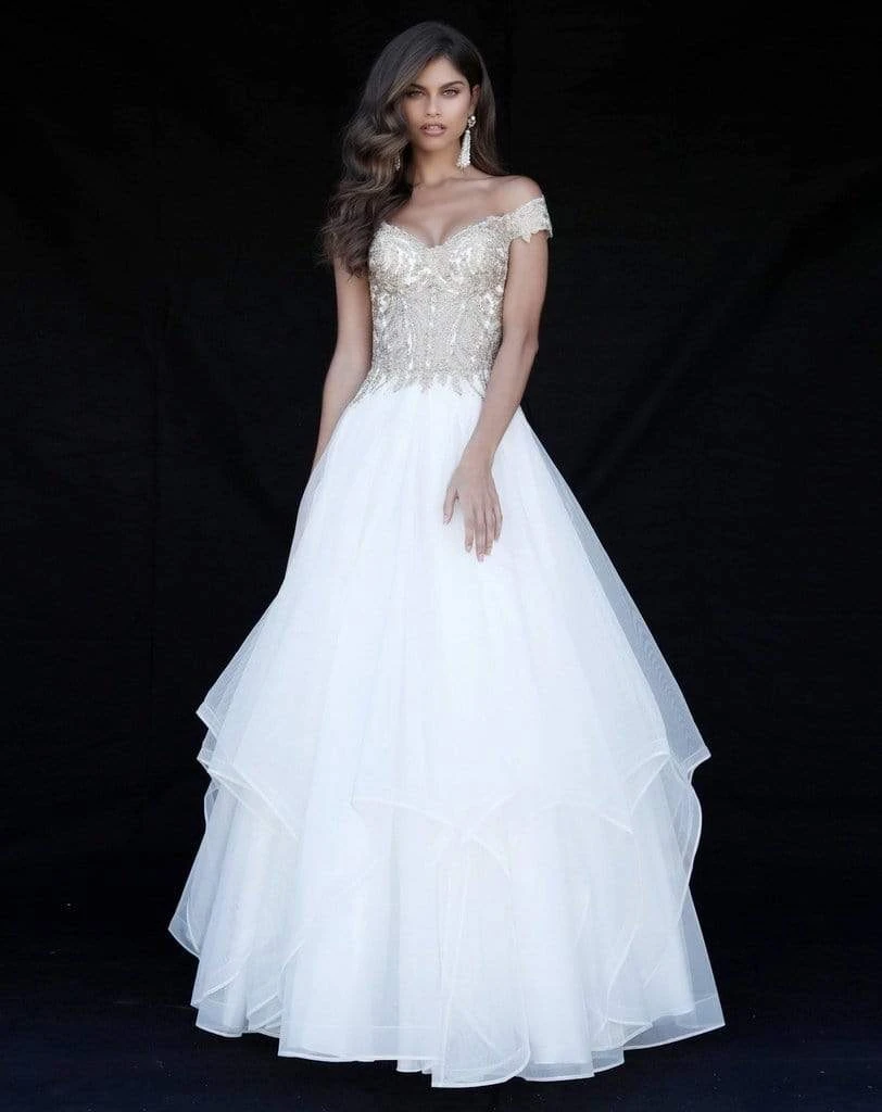Channel a fairy-tale princess in this sweet Sherri Hill 51614 creation. Embellished with metallic lace appliques trailing the corset bodice, this ensemble shows an off shoulder neckline with a sweetheart notch. Twinkling with rhinestones from the bodice to its mid-open back, the flowing A-line skirt translates into tiers of sheer overlay that finish in a full length skirt. Glow with elegance in this Sherri Hill masterpiece. Models are wearing the Ivory and Blush colors.