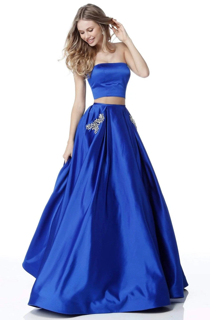 You will love this flirty two-piece look from the Sherri Hill 51649. Brandishes in a strapless, straight across neckline with fitted cropped top bodice sculpted with princess seams. Fabric in luxurious satin material, the gown shows off a bare midriff leading to the full length ballgown skirt styled with beaded in-seam side pockets. Make it your moment to stand out wearing this Sherri Hill ballgown.