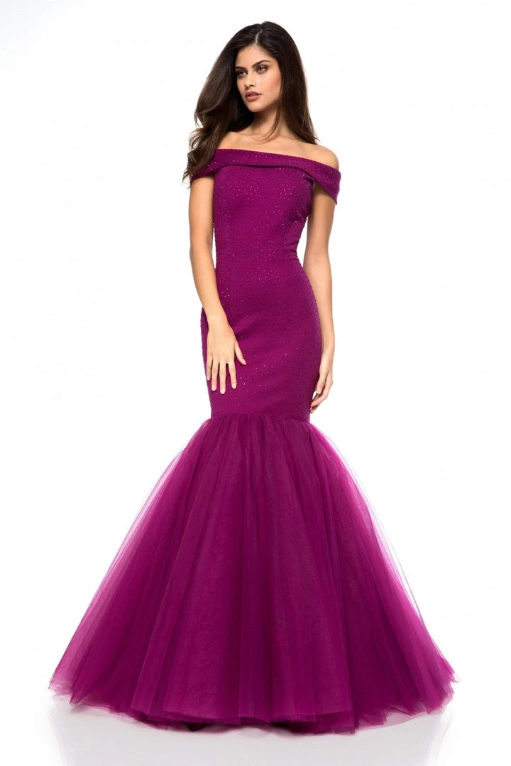 | Details: | Jersey, Off-shoulder neckline, Fitted bodice, Beading, Tulle, Mermaid skirt |