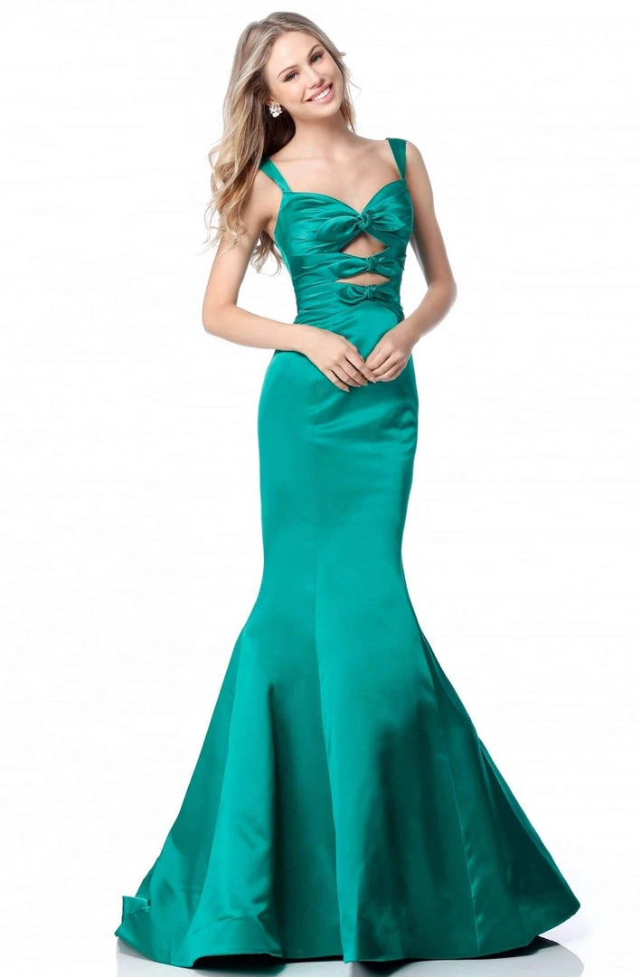 Exude an alluring flair in this fascinating Sherri Hill 51854 creation. Sleekly gathering the bodice in a lush satin, this dress flaunts a sweetheart neckline atop bow accented cutouts. Coupled with a mid-open back, this beauty shows a contoured fit over your hips and leads to a mermaid design with a train. Sashay with sophistication in this Sherri Hill masterpiece. Models are wearing the Emerald and Purple colors.