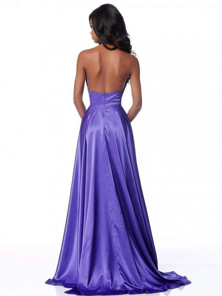 Shine like a knockout in this stunning Sherri Hill 51897 creation. Draped in a satin charmeuse fabric that ruches at the bodice, this dress shows a crisscross halter neckline with a cutout. Nipped with an empire waistband, the lush A-line skirt opens up with a high slit as it cascades into a sweeping train. Look like a glorious vision at your party in this Sherri Hill masterpiece. Models are wearing the Emerald and Purple colors.