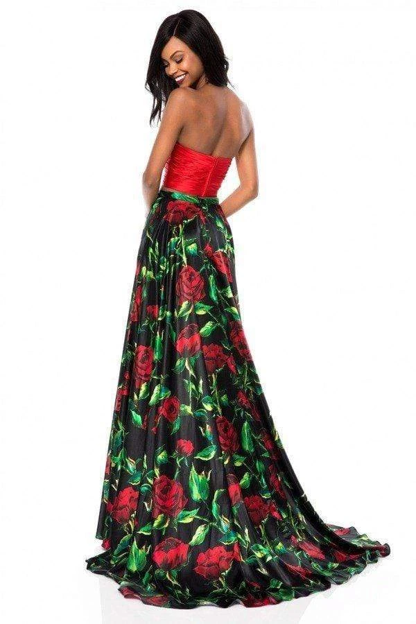 Exude that vibrant personality in this ravishing look by Sherri Hill 51937. This two piece dress fashions a strapless, plunging sweetheart neckline crop top. The floral print skirt is tailored in a full length A-line silhouette detailed with a high slit and a sweep train finish. Unleash an inner glamour that attracts all eye on you in this Sherri Hill masterpiece.