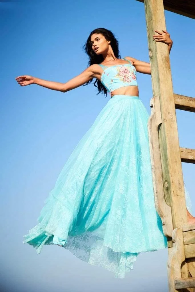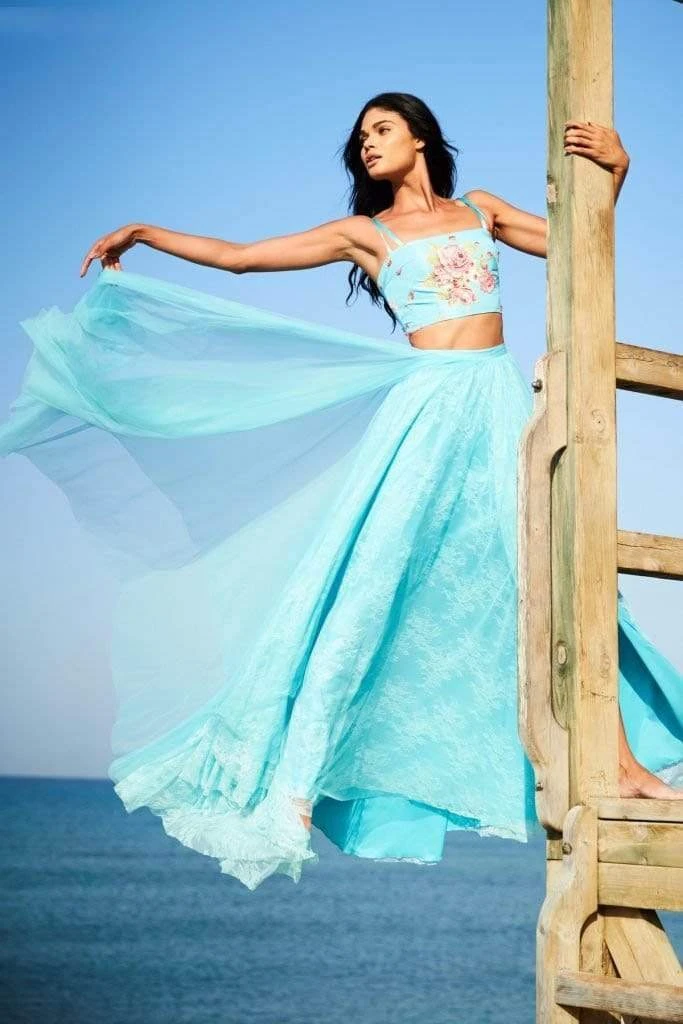 Walk the red carpet in style wearing this absolutely wonderful Sherri Hill 51945 masterpiece. This fun two piece dress features a printed crop top, scattered with striking beads and two thin straps which leads to the mid-open back. Layers of lace and tulle adorn the a-line skirt as it flaunts a side front slit and banded waist. This Sherri Hill piece is a certain head turner creation. Model is wearing Aqua Print color.