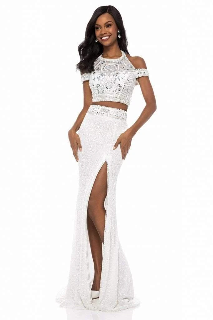 Enter the party and do that walk of a regal beauty in Sherri Hill 52009. Adorned with embellishments, this two piece ensemble is tailored in a halter neckline with cutouts. The skirt forms a fitted silhouette and is detailed with a slit and a sweep train finish. Mesmerize the crowd with your sophisticated flair in this Sherri Hill masterpiece. Model is wearing Ivory/Silver color.