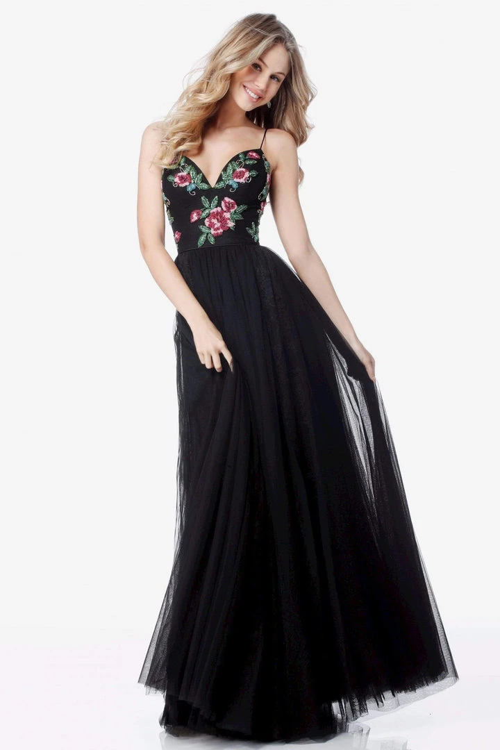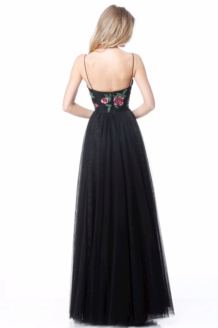 Get on the best-dressed lists in this lavish dress from Sherri Hill 52050. This floral embroidered gown appeals in a plunging sweetheart neckline with fitted bodice supported with spaghetti straps. From the waist begins a full length tulle A-line skirt. Dare to show off your style in a fashionable look from Sherri Hill.