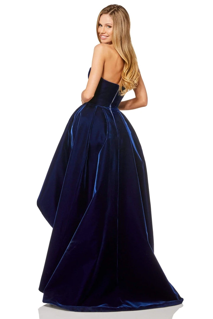 All eyes will be on you in this elegant evening gown by Sherri Hill 52144. This high-low ball gown features a strapless, straight across neckline in a velvet fabric. It has a back zipper and a sweep train too to complete the design. Get the party started in this spectacular evening dress from Sherri Hill. Model is wearing Navy color.