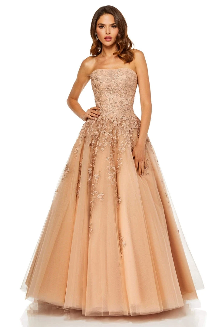 Be an emblem of utter elegance in this Sherri Hill 52341 creation. Trailing with embroidered foliage on a tulle fabric, this stunner shows a modified sweetheart neckline coupled with a mid-open back. The sheer tulle skirt layers to form into a gossamer A-line silhouette and a train. Effortlessly secure the spot of the belle of the ball in this Sherri Hill masterpiece. Models are wearing the Ivory, Light Blue and Nude colors.