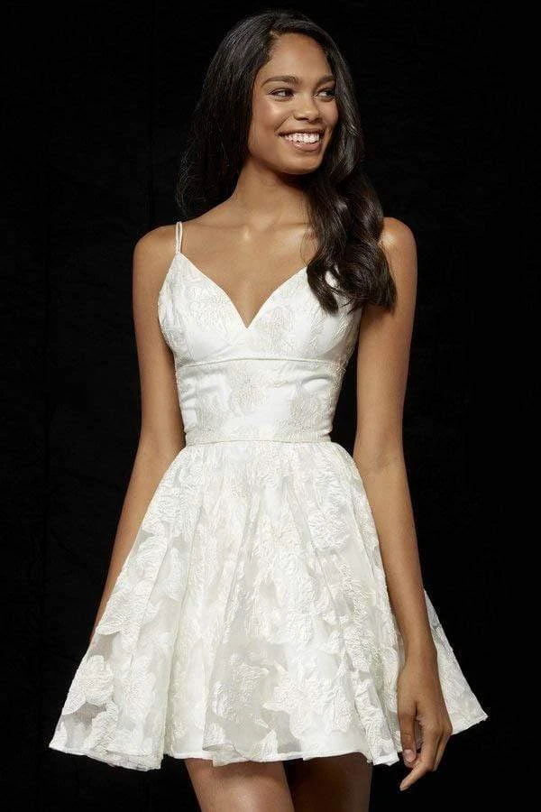 Glamour gets gorgeous with this captivating Sherri Hill 52385 cocktail dress. Made in a brocade novelty fabric, this stellar piece features a fitted bodice with a V neckline, supported with spaghetti straps which lead to the mid-open back. The a-line skirt adorns fabulous pleats that cascade to the mid-thigh length hemline. Look amazing for the party in this Sherri Hill ensemble.