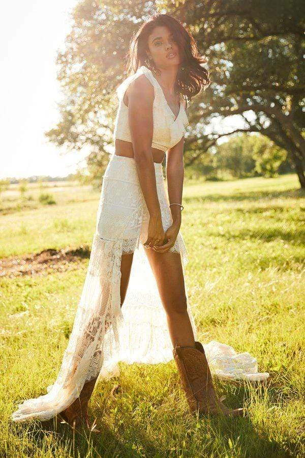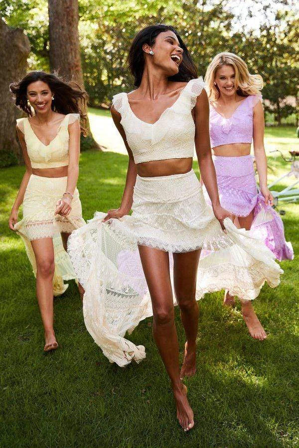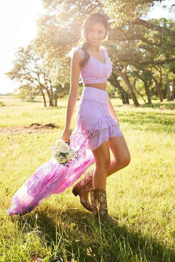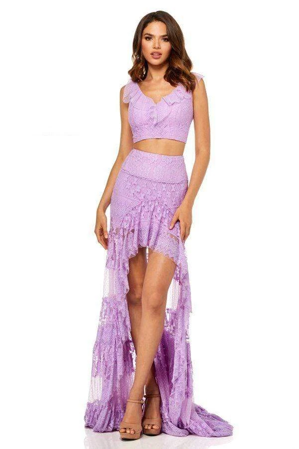 Set off your stylish style when you appear in this boho chic Sherri Hill 52472 masterpiece. This beautiful lace two piece dress features a crop top with a V neckline and lace up back enclosure while the gorgeous a-line high low skirt highlights the most superb lace detail. Surely captivate attention with this charming Sherri Hill ensemble.