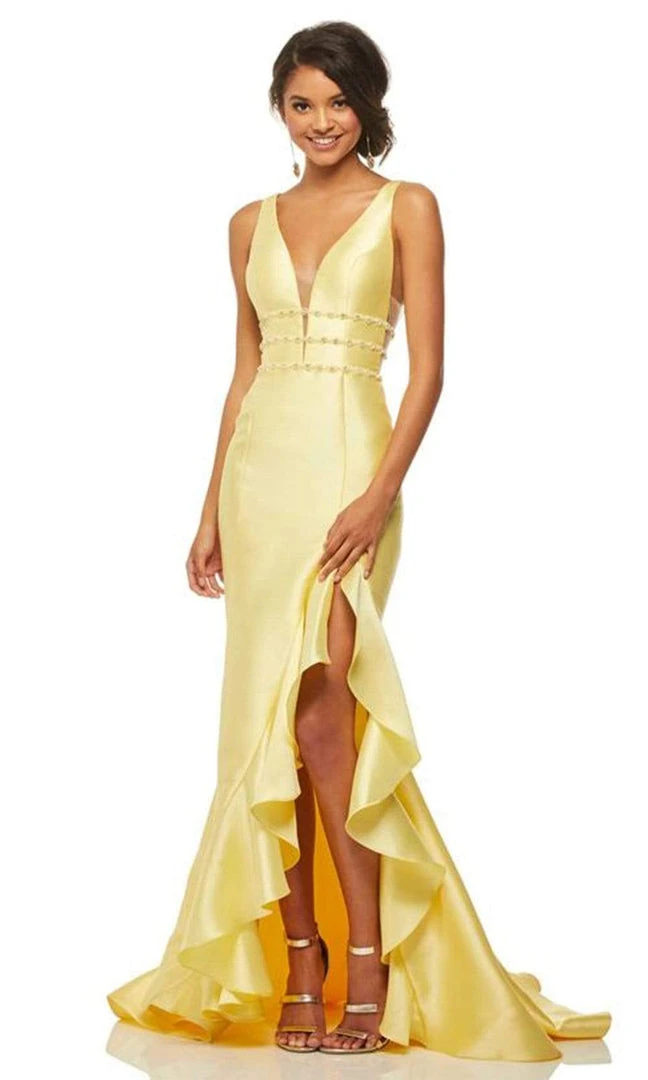 Fantasize a night of eloquent style and poise at your black-tie event while wearing this charming Sherri Hill 52576. This figure-skimming long dress is made with mikado fabric throughout and has bead accents on the thin band. It features plunging neckline with sheer panel, low back design and a ruffled thigh-high slit. Sherri Hill is perfect for a girl who wants the standout style and flawless fit. Model is wearing Yellow color.