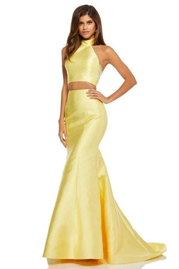 Turn heads instantly when you wear this figure-flattering dress by Sherri Hill 52579. This two piece mikado dress shows off a sleeveless, high halter neckline with crop top styled with lace appliques and an open back. The skirt tapers at the thighs and flares at the bottom to a sweep train finish. Feel dainty and feminine in this enchantingly designed dress by Sherri Hill.