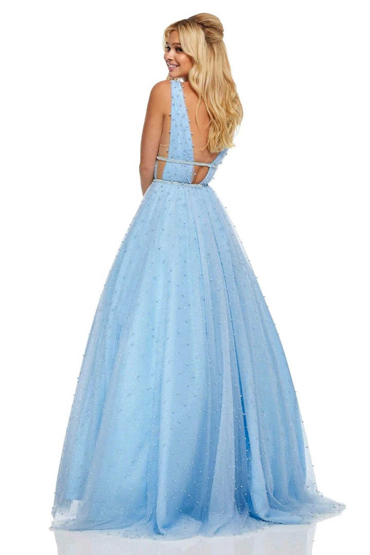 Take their breath away with this stunning dress by Sherri Hill 52640. Stands out in a sleeveless, deep V-neckline with fitted bodice styled with a low V-back and cinched at the waist with dual bands. Made of glitter chiffon fabric and pearl beading, from the waist begins a full length A-line skirt with a sweep train finish. This Sherri Hill creation is simply captivating!