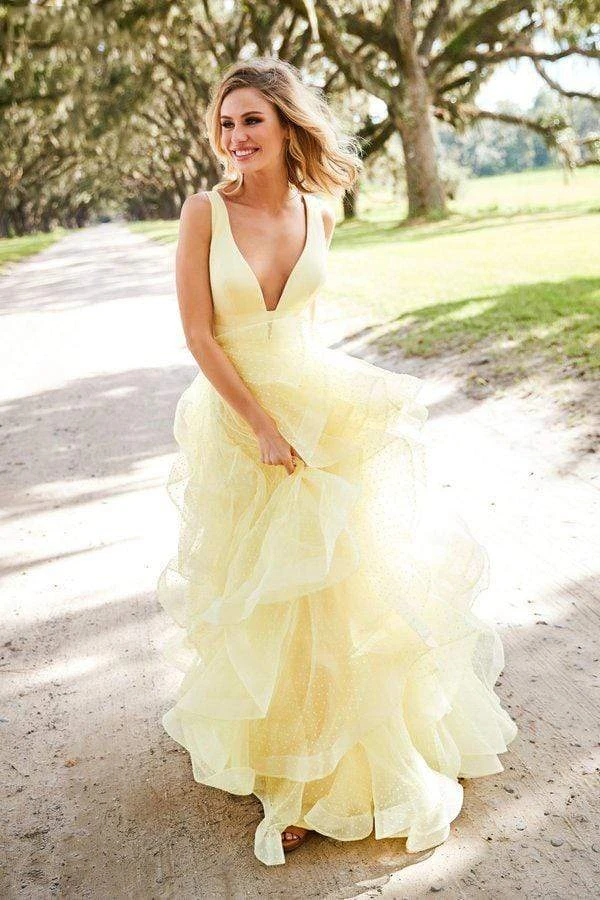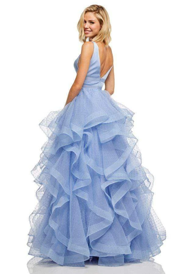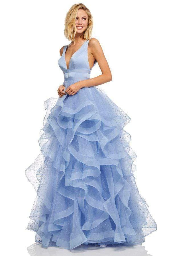 Wrap up in a winning piece for evening in this lovely Sherri Hill 52691 masterpiece. The satin bodice features a plunging V neckline, mirrored with a V back. The flounce ballgown skirt is fashioned in point d’esprit, jazzed up with horsehair edging. Look your absolute best and create a night that you will forever reminisce with this Sherri Hill creation.