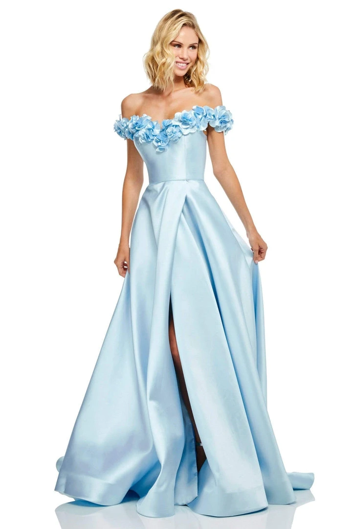 Make a statement with this dress by Sherri Hill 52712 his mikado gown pleases an off the shoulder neckline ornate with floral appliques. The fitted bodice gives way to a full length A-line skirt styled with a high slit and a sweep train finish. This Sherri Hill look is sure to be an attention-grabber in any occasion. Model is wearing Light Blue color.