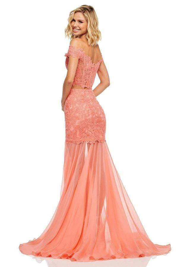 Stand out in every occasion with this daring creation by Sherri Hill 52719. This two piece lace dress enchants in a sleeveless, off-shoulder neckline crop top. The chiffon skirt fits at the thighs and flares at the bottom styled with an alluring slit and finishes in a sweep train. This Sherri Hill dress is a stunning look for your evening occasion. Look good and feel good with this extravagant ensemble from Sherri Hill.