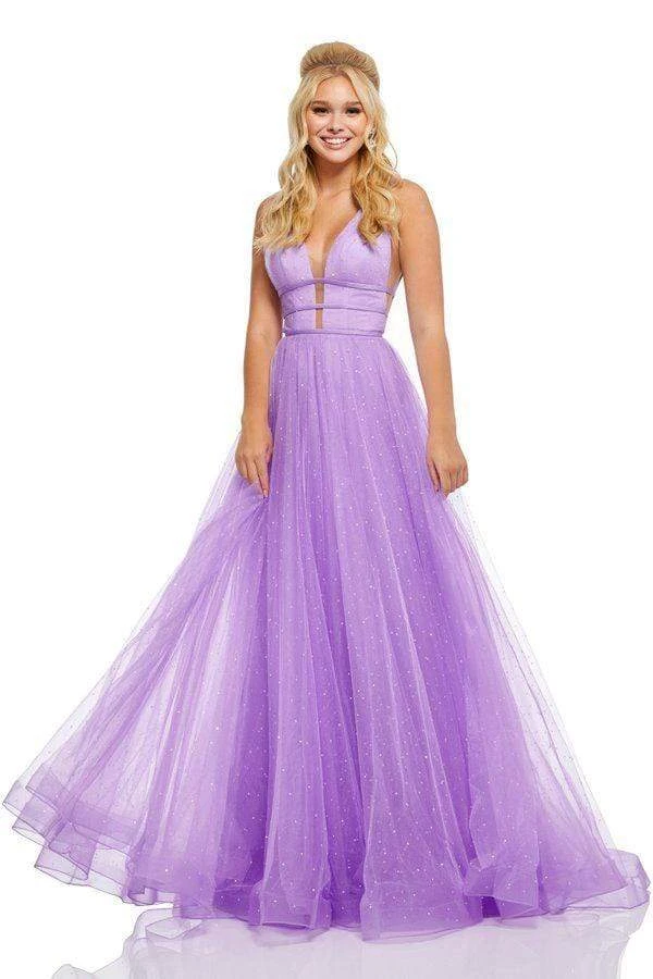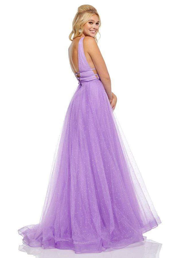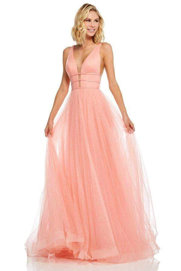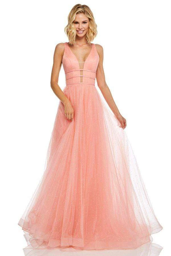 Enter the hall with grace and beauty in this lovely Sherri Hill 52737 evening dress. This charming gown showcases a fitted, beaded bodice framed with a plunging V neckline, illusion side panels, deep V back and triple satin ribbon bands around with midriff with back bow detailing. The long, a line skirt is tailored in tulle layers sprinkled with heat set sparkling stones and a sweep train. Be ready to capture the spirit of that romantic evening in this Sherri Hill piece.